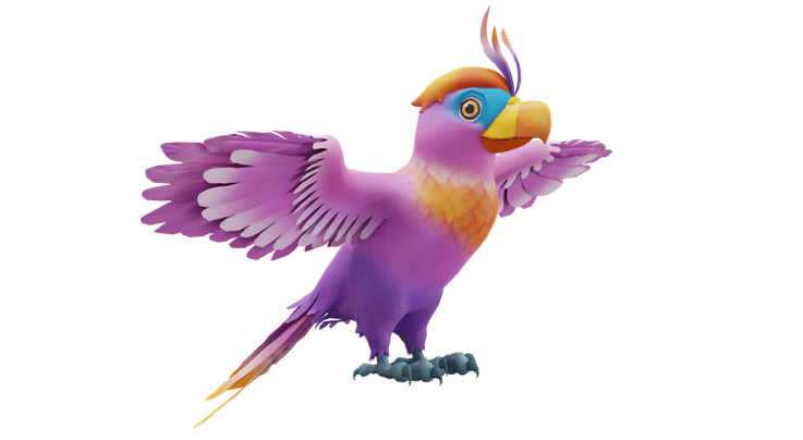 As one of Princess Tata's dearest companions, Tuka the Parrot emerges with an adorable pink and purple feather, accentuated by a vibrant orange tail, a signature feature of the Land of Myriad Blooms.