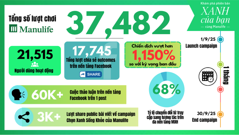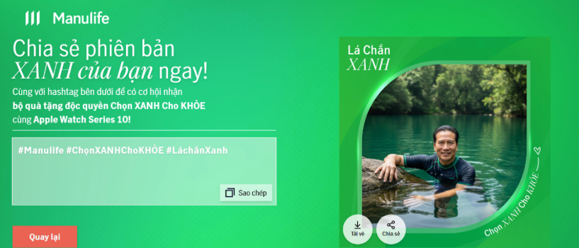 Chiến dịch “Chọn Xanh Cho Khỏe” đã mang lại kết quả vượt ngoài mong đợi, trở thành một trong những điểm nhấn truyền thông nổi bật của Manulife trong năm. Người dùng hào hứng tham gia và chia sẻ “phiên bản xanh” của chính mình, tạo nên làn sóng viral tự nhiên trên mạng xã hội. Mỗi hình ảnh được tạo ra không chỉ đơn thuần là sản phẩm của công nghệ AI, mà còn là dấu ấn cá nhân — nơi người dùng thể hiện phong cách sống, giá trị và ước mơ gắn liền với thông điệp thương hiệu “Chọn Xanh Cho Khỏe”.